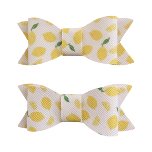 Crafted from faux leather fabric and attached with metal alligator clips and featuring bright lemon designs, the bow clips make the perfect statement.