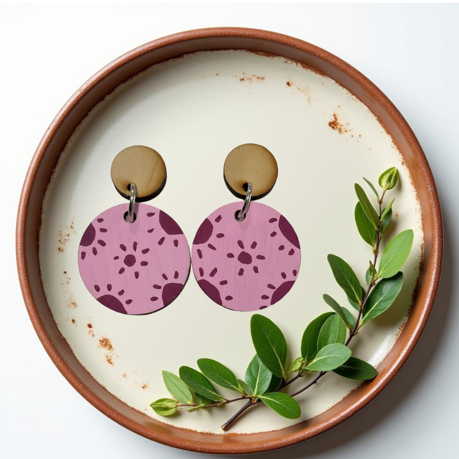These one-of-a-kind earrings feature a beautiful pink floral design, handpainted on lightweight wooden dangles.