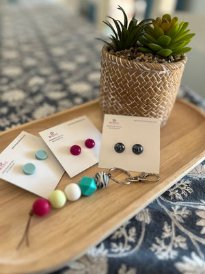 Update your everyday look with this gorgeous gift pack featuring three pairs of stylish stud earrings and a trendy bead keyring