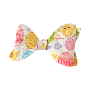 Celebrate Easter with this charming handcrafted bow featuring delightful chicken and egg motifs.