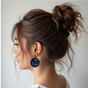 These stylish round wooden dangle earrings feature a charming dots and dashes design using a colour combination of navy, pink and gold.