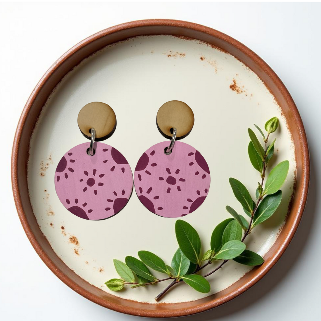 These one-of-a-kind earrings feature a beautiful pink floral design, handpainted on lightweight wooden dangles.