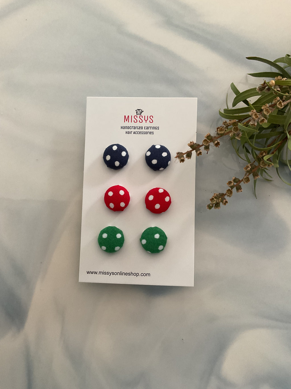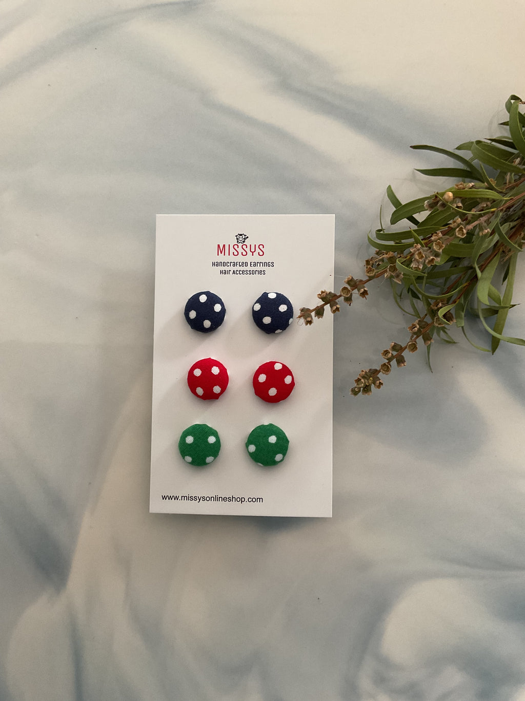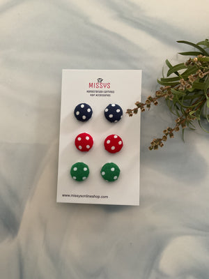 These colourful earrings, covered in vibrant green, red, and navy polka dot fabric, will add a playful touch to any ensemble.