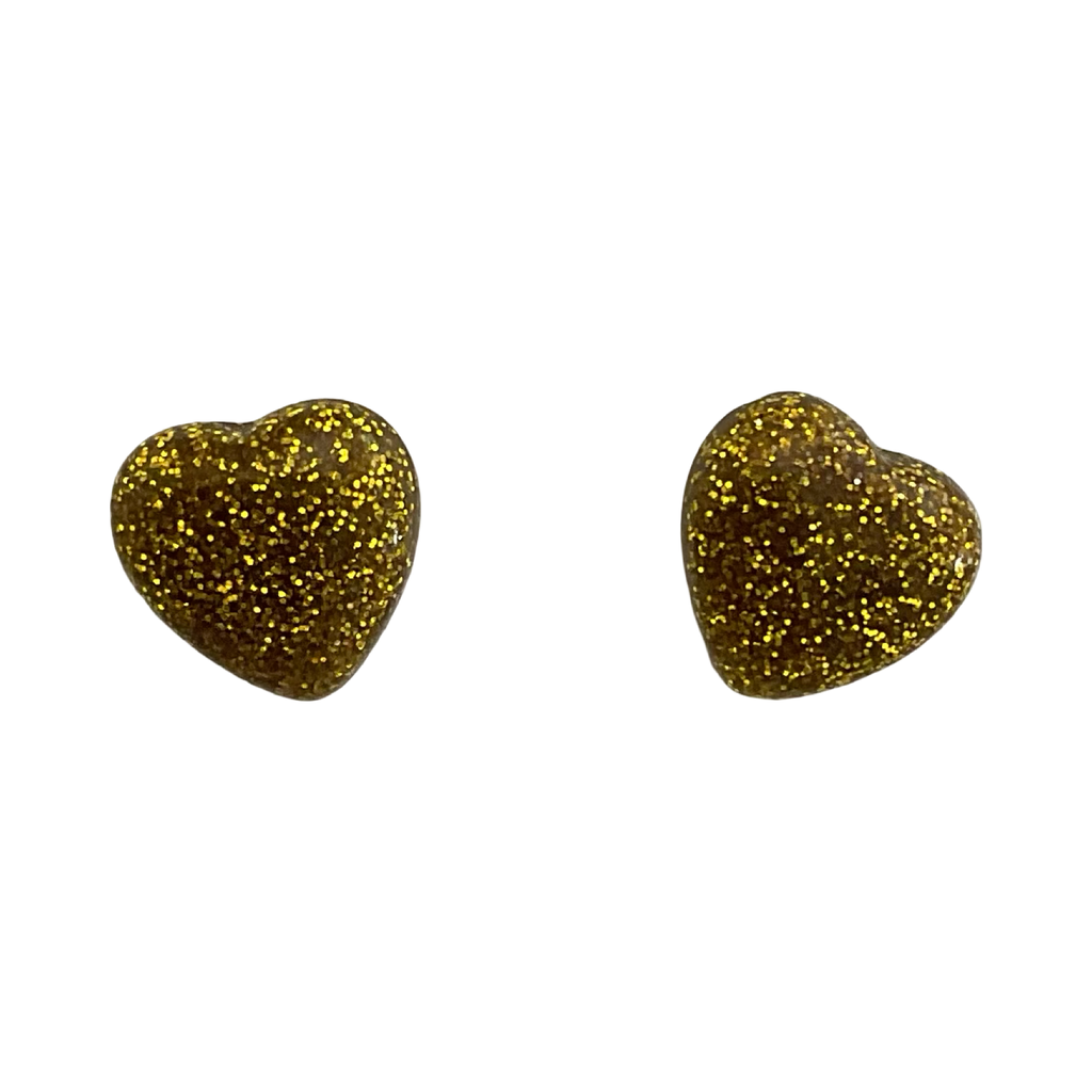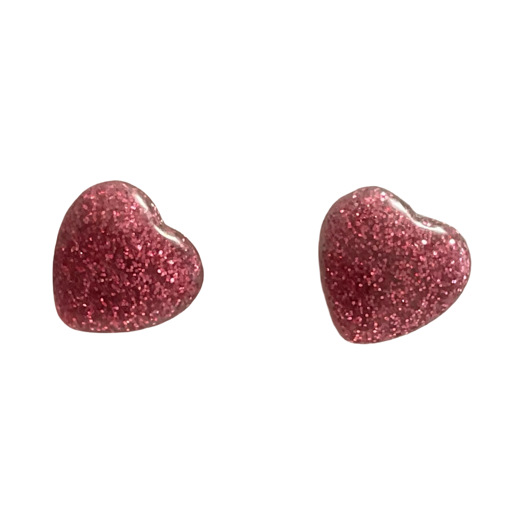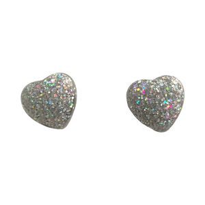 These pretty stud earrings feature unique blue hearts and are made with durable resin and a hint of sparkling glitter.
