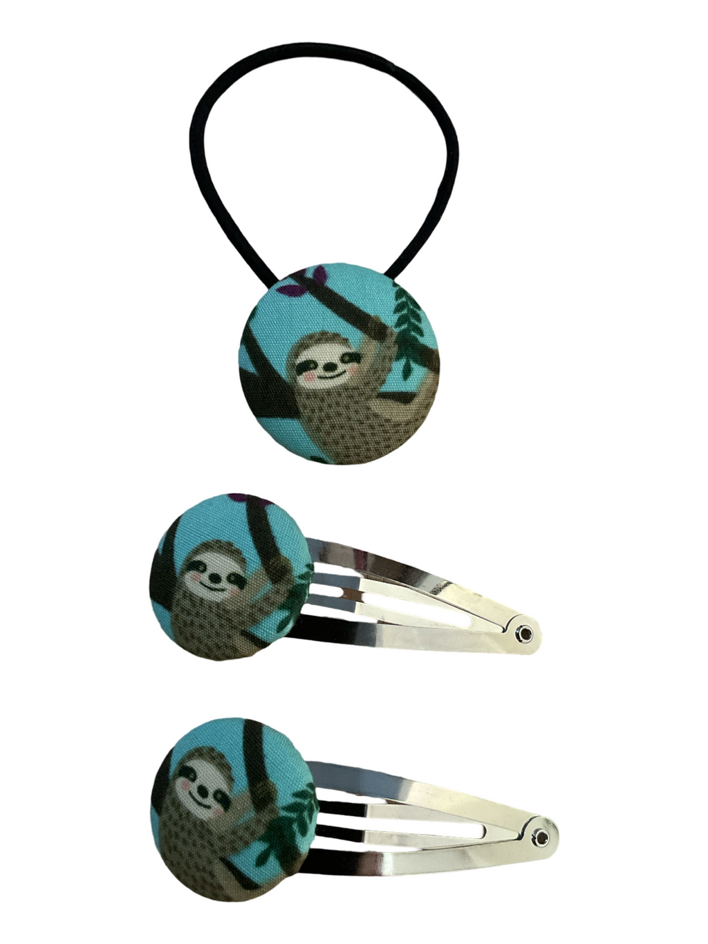 Fabric covered button on silver snap clips and a fabric covered button hair tie with elastic