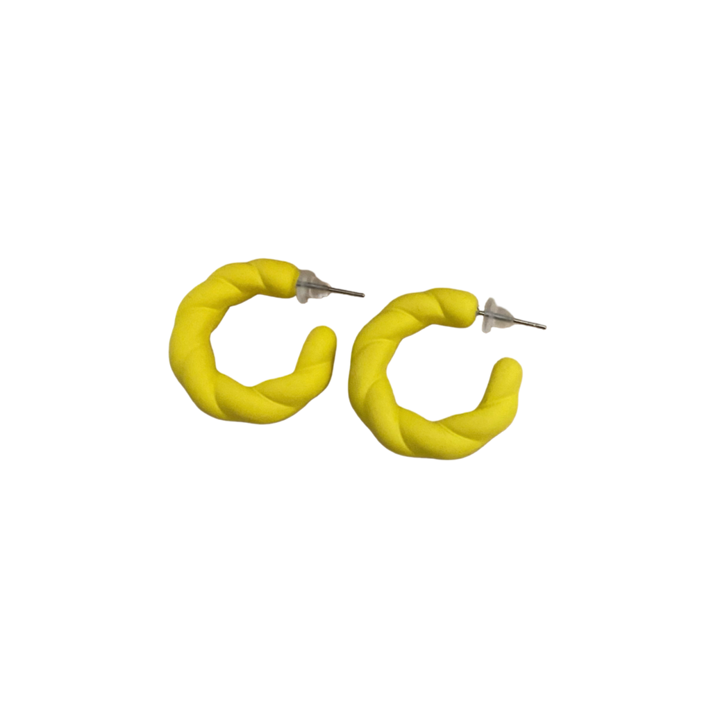 These bright yellow stud acrylic droop earrings feature an unusual twist design that adds a unique flair to your style.